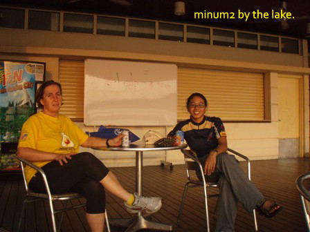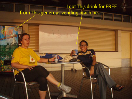 Another weekend outing. Last Sunday.Went cycling with Nurina. Met at her place as agreed. Drove to Putrajaya and started cycling at the info center car park. Lovely weather, it wasn’t to sunny, some cool wind, and we were off. We didn’t exactly plan which route to take, but we did 1 big loop around Putrajaya which my friend showed me before. A couple of hill climbs, and other than that we were fine.. but as soon as we reached the last (or was it te 2nd last) a strong gush of wind slowed us down. Luckily it wasn’t very long. Total distance a 25k ++.. Total time 1hr 9mins. Nothing to boast off here. just an easy, short ride. plus an after drink by the lake ! The restaurant near the lake was closed, so we ended up drinking 100plus and ice lemon tea from the vending machine. Funny part was, i got my can of drink for free. It was quite a while since i last got a drink from vending machines (healthy life style huh?!), and this time i’m buying my drink from a machine, with a slot for coins, as well as notes.. it was like 3 seconds thinking ‘eh, do i put the note in first or do i select the drink first.. ‘…. ‘Select first !’ so thats what i did.. pressed the ice lemon tea button, and right away, 1 free ice lemon tea for me.. what a good laugh nurina and i had ! (kan jimat if all vending machine operates like this !) Looking forward fo rmy next ride with Nurina, and hopefully a few other ladies. The more the merrier ! Whoever interested do contact me through email :