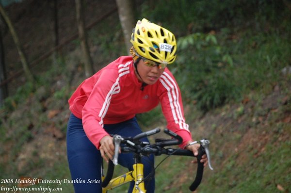 Bike : Love the hill. Hahahhaha… only 3 loops this year compared to the 5 loops in UM-NFC Duathlon last year. Some were already walking with their bikes. I made sure I had the right gear on before I hit the hill. So tak payah nak tukar2 gear sangat on the climb. Ros (Powerbar team elite) tak sudah2 psycho aku, asking me to chill, slow down and let her sister (who came in 3rd in uni category) to overtake me. Hahaha.. A good thing she gave me that psycho of a motivation. Cycled faster, but again, no idea how fast I was speeding as I haven’t changed the meter battery. Down hill, was rollercoaster. Enjoyed it.(Kakak2 tandem bike said downhill was like orgasm..hahaha!) The first 2 loops did the down hill pretty fast and used that downhill speed to build in the momentum to climb the following but less steeper hill ! Save energy kan ?! Anyway, 3rd loop was a near tragedy for me and another racer.