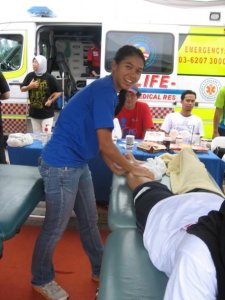 2nd day of the course, more practical ! Apparently our tent was near the ambulance for the runners, from which we at the massage booth could have benfitted if 1 of us pengsan/fainted out of our fatigue massaging those concrete calves ! LOL ! I was with some of the course participants at Dukethon massaging runners post race. 🙂 I massage around 8 people ! Including 1 hairy guy.. His hairy legs hurt my knuckles alright ! Tiring morning but fun. Foto courtesy of Shahrizal Sanusi, a runner friend who happened to pass the booth after his run ! 🙂 Thanks again Shahrizal !