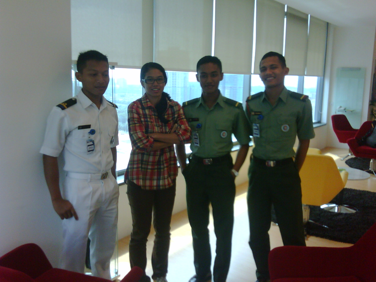 a group shot with the UPNM boys, thanks to Paรกn (farhan) yg tak reti kasi signal before snapping the foto. hehe.. not in d picture; Chan (tengah di interview time nieh). anyways fr left : Hisham Halim, missjewelz, Muhammad Amirul Hafiz and Ahmad Syazwan Rusli. All dressed up so smart and fine in their no.3 uniform.They were all there to give support to Chan, and representing the UPNM Triathlon Club. and these are familiar faces I see doing triathlon, running and adventure races. Hats off to them. p.s. : I consider them as my own adik ๐Ÿ˜› (how i wish my own brother + sisters would take up running/triathlon as well !)