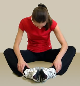 3. Slowly let your knees fall open to each side and slide the soles of your feet together. 4. Rest your hands on your ankles. 5. Gently round your spine and roll your shoulders forward. 6. Slowly lean forward, lowering your upper body toward your legs. Stop when you feel the stretch in your inner thighs (see photo B). 7. Inhale (breathe in) through your nose, and exhale (breathe out) through your mouth, as you complete this stretch. 8. Hold this stretch for 30 seconds. 9. Return to starting position by rounding shoulders back and extending your spine to upright position.