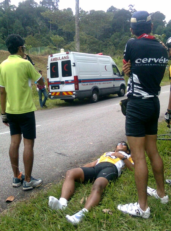 • I can’t imagine how he fell, catapulted etc.. but Shakhir mentioned after the incident Rusfarizal was blur, speechless, still in shock (and of course in pain), sat in the middle of the road. He just couldn’t move