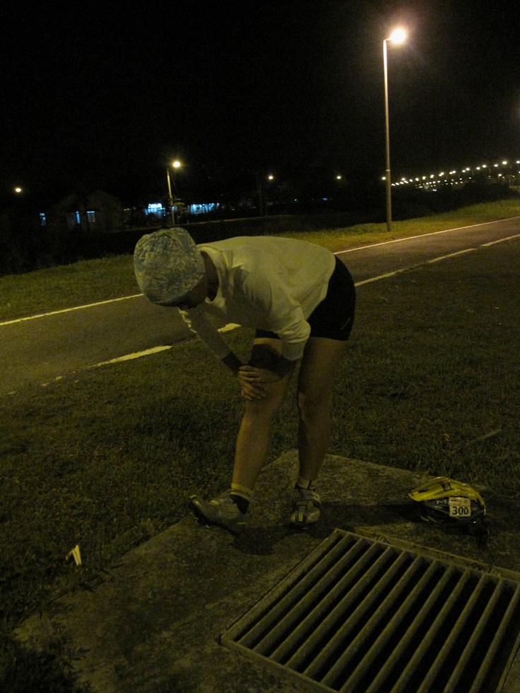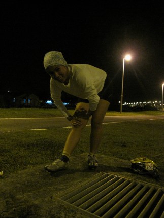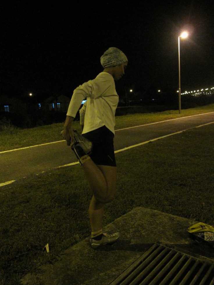 Back to my workout yesterday : Cycled for 15 mins (warm up) before stopping on the road side for some stretching.Pictured below. And then continued for another 30 mins of the main workout. That is, a low intensity work out, as force was not applied. Maintained an easy gear but shift a gear heavier once I find my upper body + shoulders moving too much or my bum bumping on the saddle ! And maintaining that high cadence through out the ride. After that,a quick transition, popped the bike into the car and off for a 2km run. This Saturday I’ll be doing the Energizer Run. Since I haven’t been training as I am really tied up with other priorities at the moment, I’m doing the 10km. Some fotos of me stretching :