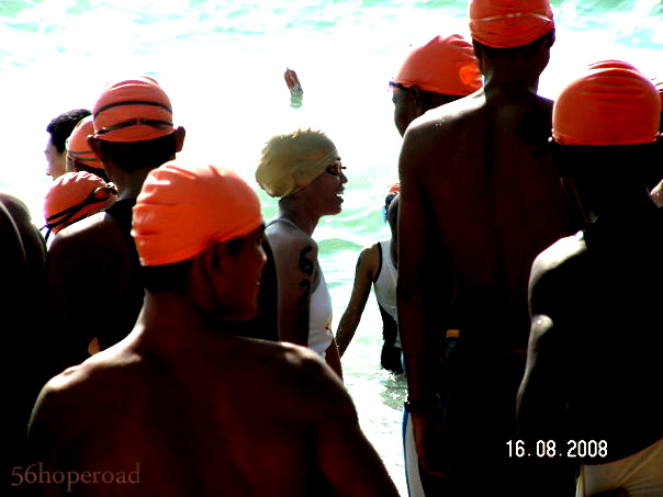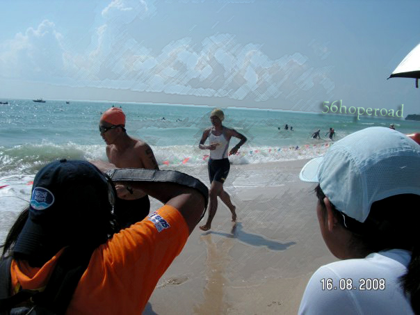 One of my favourite photos.Exiting the swim leg into T1. Picture courtesy of Rahimi Abdullah. 🙂 And he gave me the Powerbar trisuit (my 1st !) p.s. this foto was not edited. The Powerbar beach flags did stand out.