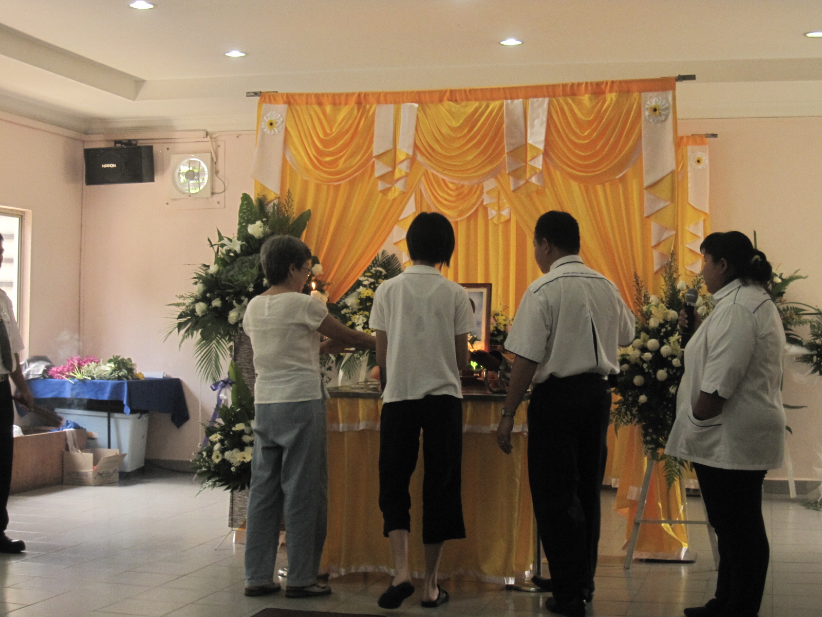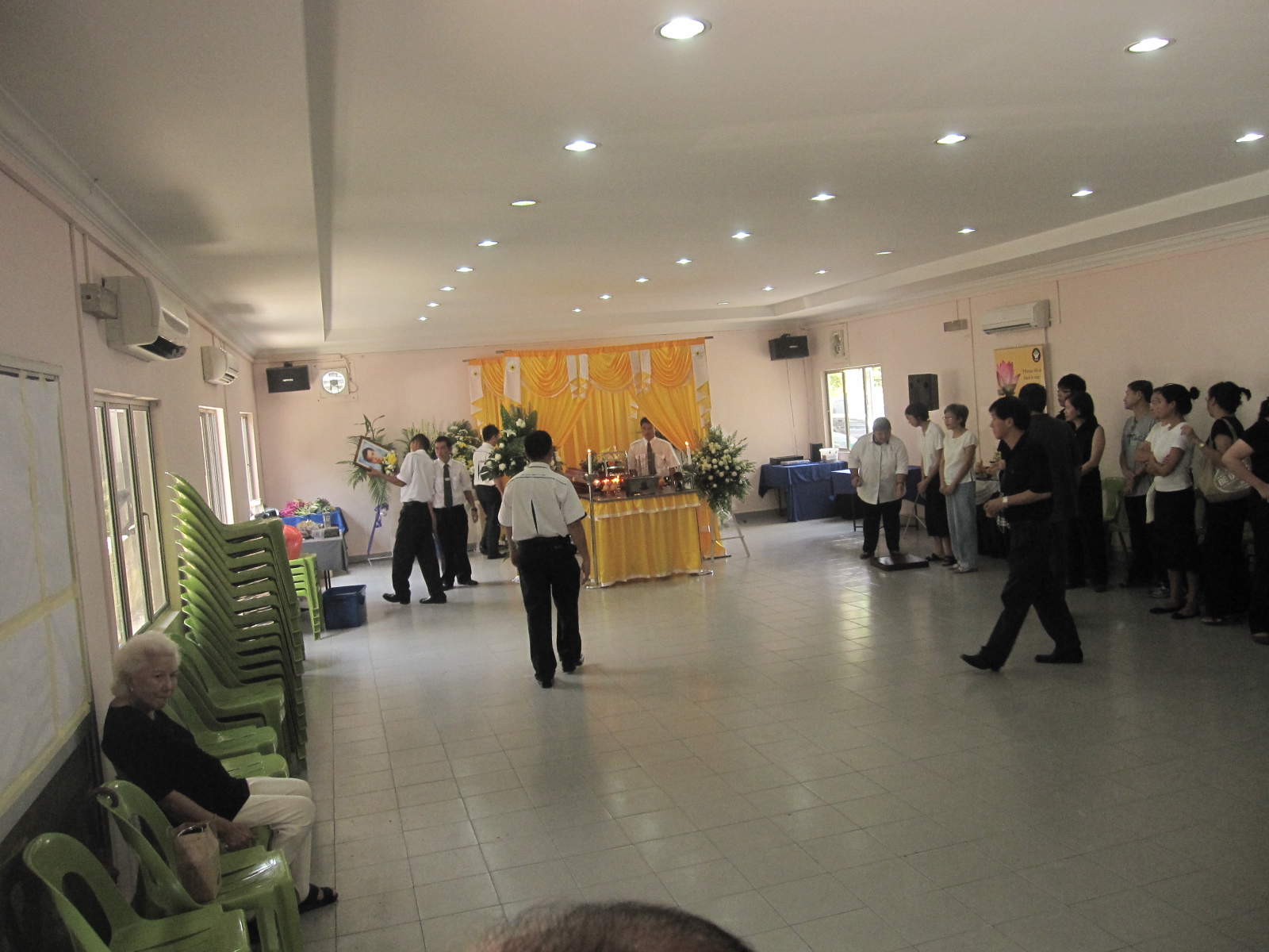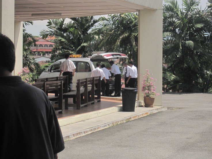 The coffin/casket people(sorry I don't know what exact term to use for them!) preparing for coffin to be taken to the van which will take it on its final journey to the cremation center next door...