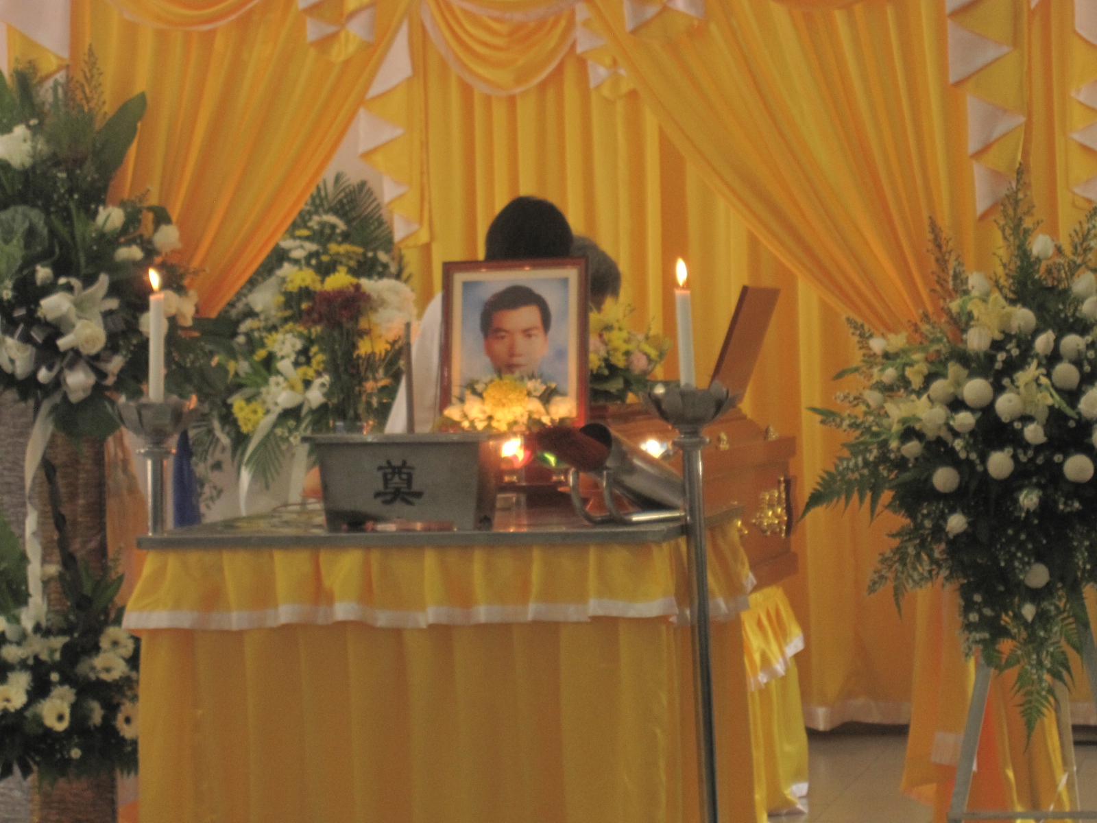 The lady in white blouse and denim is Pin Pin, Ngae's widow, and their youngest daughter Xian is the one kneeling down. They headed the last respect for Ngae, followed by family members, and friends.