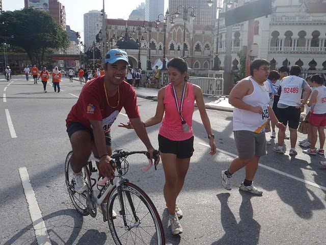 I ran the race with Nik Fahusnaza, yeap all the way.Though at this section he inched ahead to get this shot. Pic before this was also by him. Thank you Nik. We mixed the pace, some parts were a bit slow, some cruise pace..some fast a bit... depending what we felt like that time loh.. He is having some ITB problem, and my right ITB were not complaining as much (as SCKLM) , so managed to control the pace without much discomfort. Learn to listen to your body people... Both of us (plus Syah) couldn't have sprinted the last 1k if we continued to push on when we felt some pain/discomfort during the run.