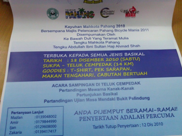 Kayuhan Mahkota. πŸ™‚ anyone interested ?! The Bukit Pelindung challenge, (road) will be interesting. The road up the hill 'takde la steep sangat'. πŸ™‚ Heard riders from the east coast are gearing up for it. What about you ? Ada berani ?