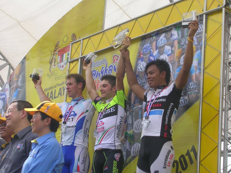 After about 15k into the stage, 2 riders from Champion System and Suren cycling team went away on a long brave break away attempt. The peloton was happy to let the yellow jersey team Farnese Vini take control on the front. The pace was relatively slow just averaging above 40kph. The gap grew to a maximum 6 minutes before start coming down. With 2 break away riders taking the 1st and 2nd on all 3 intermediate sprints, Terengganu Pro-Asia riders Anuar and Harrif fought with the race leader Andrea Guardini toe to toe for 3rd placing and 2 bounces points for all 3 intermediate sprints. With the help of TSG teammates Anuar winning 2 out of 3 and equaling the total points standing by end of 3rd sprint. The peloton caught the 2 escapees shortly after the last intermediate sprint. The peloton was setting up for bunch sprint. The last 5km was almost dead straight, many teams were trying to set up their train for the sprint. The speed was averaging around 60kph, the high speed and teams fighting for best position resulted in 2 major crashes in the last 1km. Yukiya of Europcar was clipped in the last 200 meters to the finish and landed hard on his head and face. The yellow jersey once again managed to cross the line 1st with Anuar in toll finishing 3rd. Anuar’s podium placing and added bonus time, he is now 2nd overall in the GC and leading the Asian jersey classification.