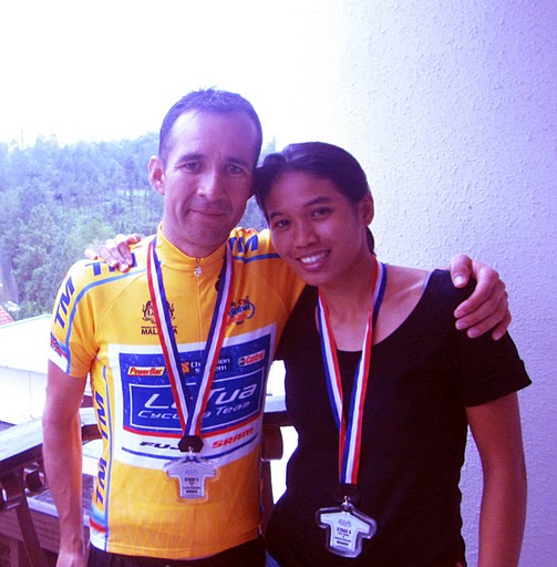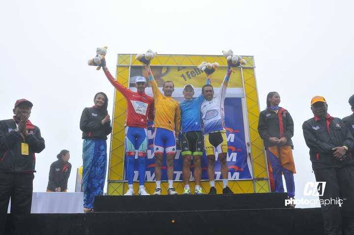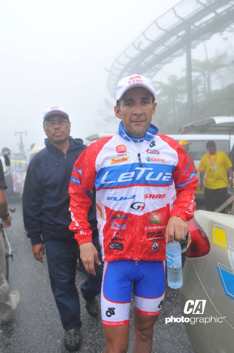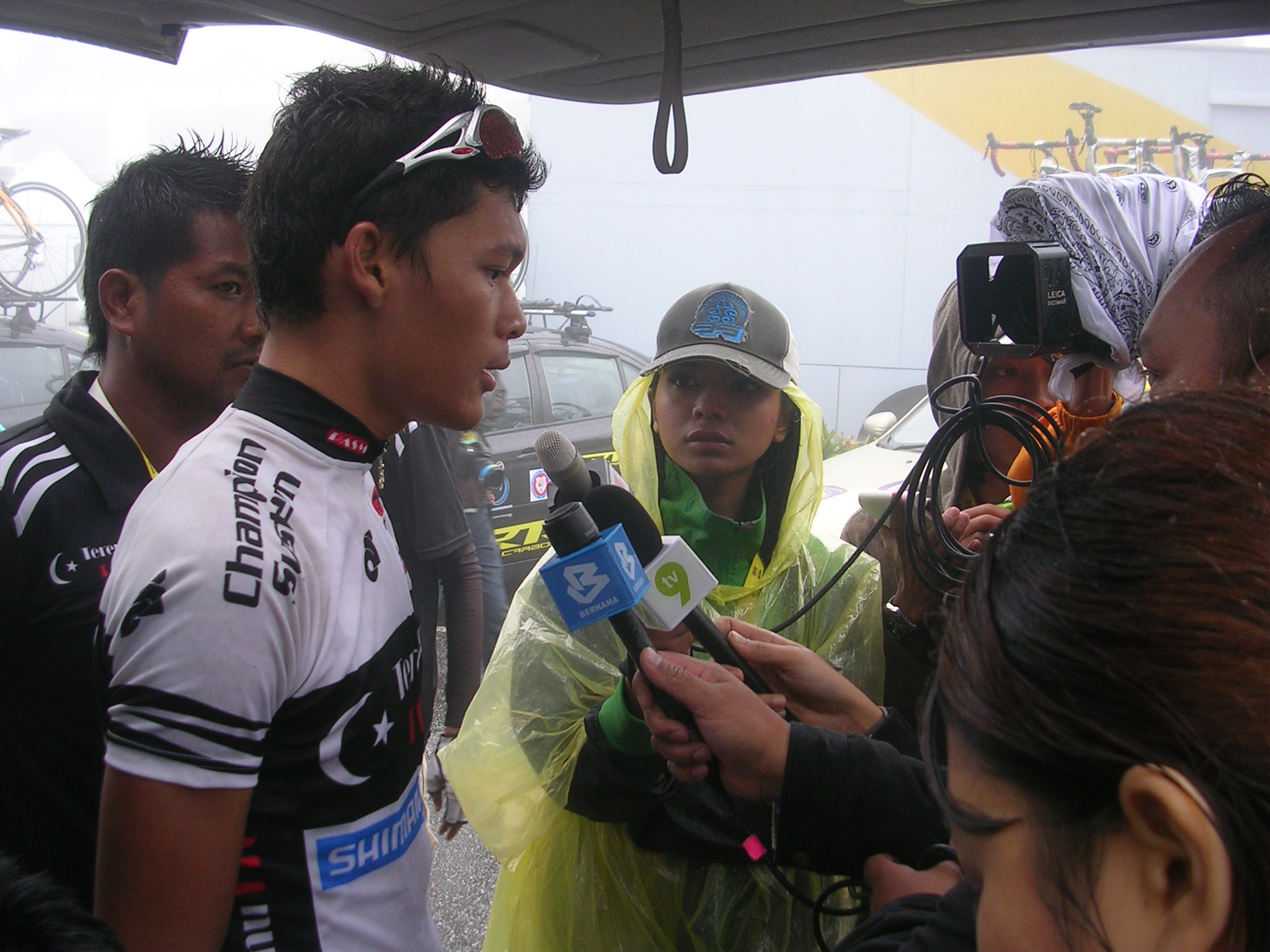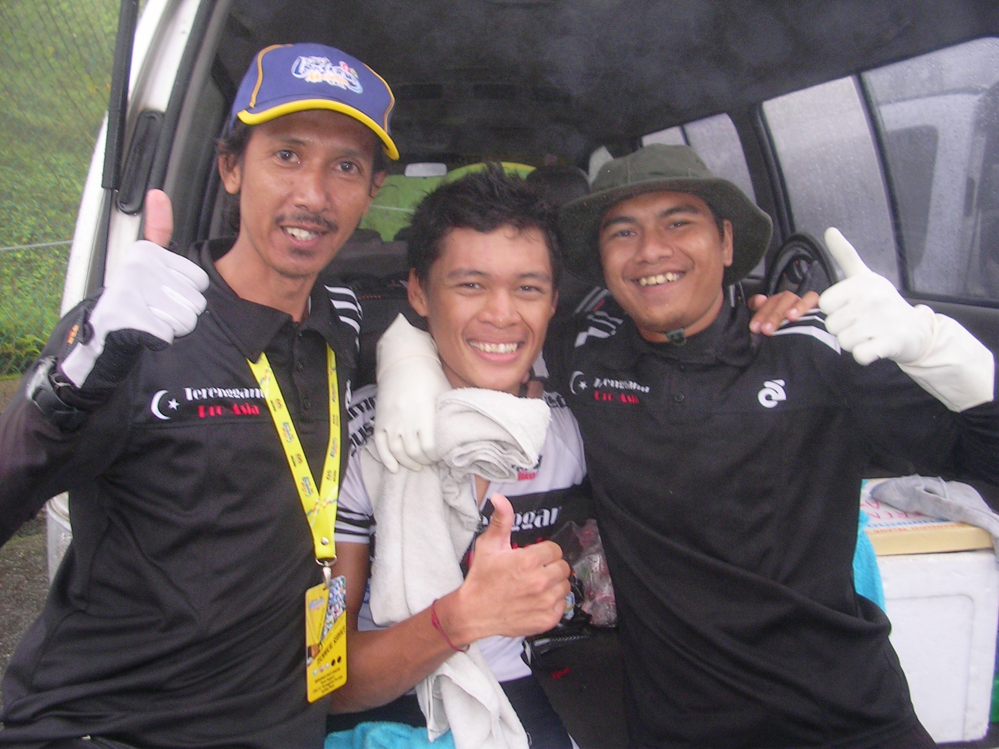 Meanwhile with about 10km still to go to the top, the front peloton was down to just about 30+ riders which including Phuchong, Mat Amin and Saufi for Terengganu Pro-Asia. As the road really kicking up over 10% there were many attacks from each team’s top climbers, the yellow jersey could not follow the pace any longer. Phuchong and Mat Amin were also fighting hard to stay with the elite climbers but were eventually dropped but both finished in respectable 40 and 41st position loosing only about 7 minutes. Meanwhile, TSG’s Saufi at age of just 20 and 1st time racing at this level, spinning his legs like a man (or boy) possessed and following the 1st group of very selected climbers of just 20 riders through the brutal rain, gusty wind and dense fog, the temperature was around 15. It was hard to image the race is in Malaysia, more like images out of a hor stage in Giro. Later Saufi told reporters that he just imaged he was Lance racing up the Alps in miserable condition. Saufi was dropped from the super climbers only less than 4 km from the summit, but he was still riding with guys like Alex Howes and Kirk Carlsen of Chipotle Development Team, lost only 2 minutes to stage winner. TSG’s 3 climbers lifted TSG to 8th team placing overall ahead of much bigger and more established teams like Colnago CSF, Skil Shimano, Landbouwkrediet, United Healthcare, etc.