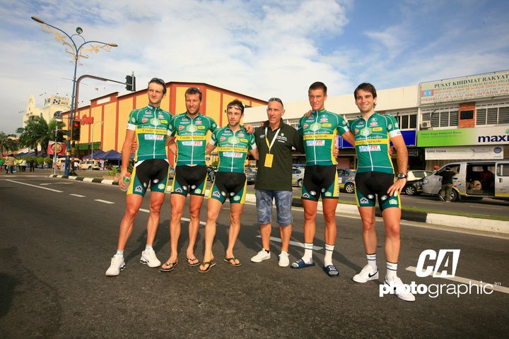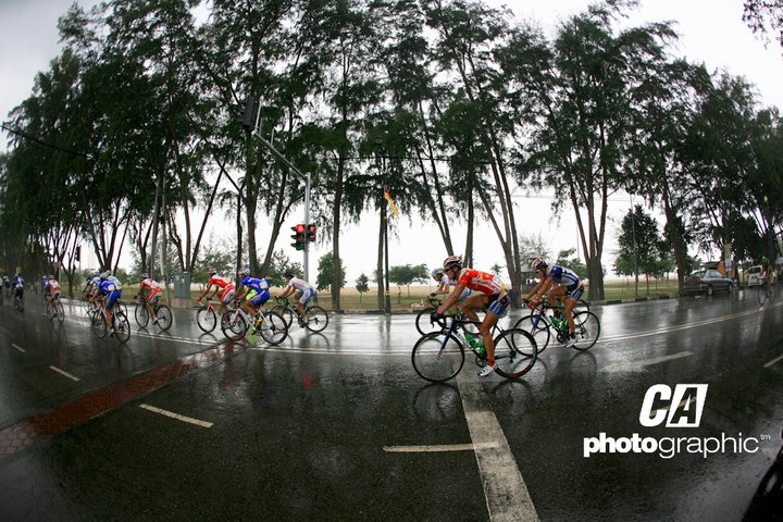 Attacks started immediately from the start as expected. 5km into the race 4 riders made break which was later joined by 4 more riders at 15km mark. But none of the riders post any real threat to the top GC riders (the highest placed GC rider in the escape group was more than 6 minutes behind) so the leading teams let the 8 riders established a 4 minutes lead by the half way mark of race. At 85km into the race, the dark sky finally opened up with heavy rain. Riders thought the heavy rain will provide a perfect cover for a new escape attempt, many tried to break away and speed in peloton shut up to over 50kph stretching to one long line. The time gap came down as fast as the pouring rain, by the 100km mark the gap is only 2 minutes. In the last 20km, the gap is about 1.5 minute . There were more reactions from the peloton as riders trying to counter attack. The peloton was all back to one piece into the last 4km, TSG riders were trying to take Anuar up to to the front for the sprint finish but no one including Anuar knew that his rear wheel suffered a slow puncture, Anuar was having difficulties moving up to the front. To compound the problem, the finish profile was actually down hill instead up hill as race manual provided. By the time TSG’s 2nd sprinter Harrif realized that Anuar was not able get up to his wheel for the sprint, it was too late for him to go for the win. Call it bad luck or poor judgment or poor race info, no excuses for TSG unable to deliver the win and keep the point jersey.