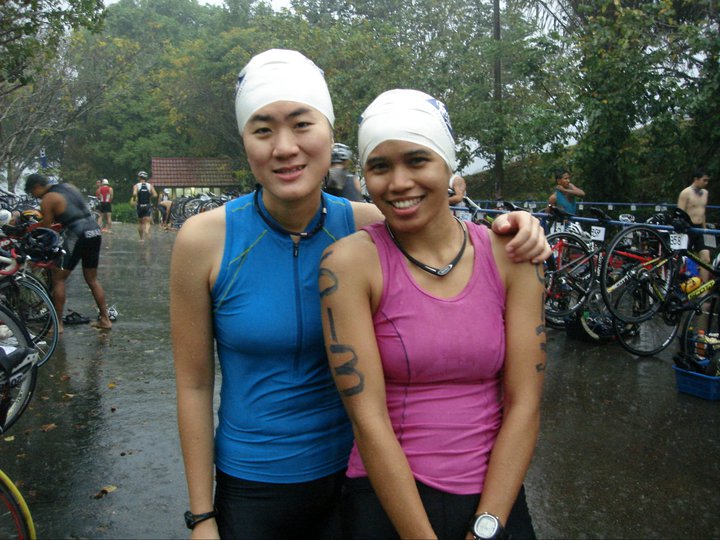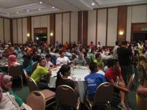 Eve : as usual, the carbo loading dinner (i have started loading earlier in the week) and the best race briefing in the world (as quoted consistently by IM Sofian). Saw the UPNM boys, the usual tri suspects and some new faces. Jaja was in her BRIGHT pink jacket i could spot her from across the hall. Sofian as his usual self with Tip. Tip ‘tapau’ed some bananas in her bag. Potassium alert !