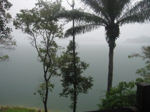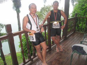 So the training plan for pre-race day was a short swim-bike-run, but since it didnt stop raining until late noon Fairul, Hanchik and I went for a dip in the lake. OOwwweee…the extra opposite of Tioman. Tioman- blue, Kenyir – black ! The water was clear alright but I couldn’t see anything beyond 2 meters. In Tioman went I swam out solo nearly a 100m out I was confident, but not this time. I had to resolve to the breast stroke apart from asking Fairul to accompany me side-by-side during the test swim. I wouldn’t want to bump into or swim with a giant fish. Or any fish for that matter ! It was only a short 250m swim out before we turned back. I wonder what Barry Lee was thinking when he swam the whole loop of 750m alone !!!! He must have swam fast enough not to think of any creatures swimming next or behind him.