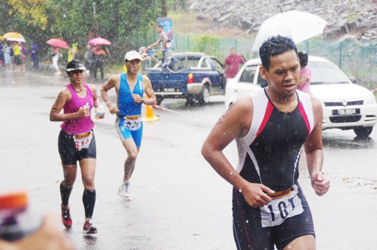 Slowly carried the bike up the stairs, before getting on it and cycled to the transition area. I still had to push the bike UP hill near the entrance of the hotel. I was not surprised to see not many triathletes at the transition. Some were enjoying the shelter of a nearby pondok/gazebo and another tent. The others were on their way, slowly I suppose. I was sure that the race start will be delayed. I was right. That, on top of a biathlon plan by the organizer. It was raining non stop since yesterday it flooded part of the bike course, a stalled lorry ON the road. My presumption was true, we did start the race later than schedule (after the rain eased a bit). And good news was, we still get to do the triathlon instead of biathlon. Chan Chee Seng couldn’t stress any further how important it is for us to slow down when going down hill to avoid any mishaps.