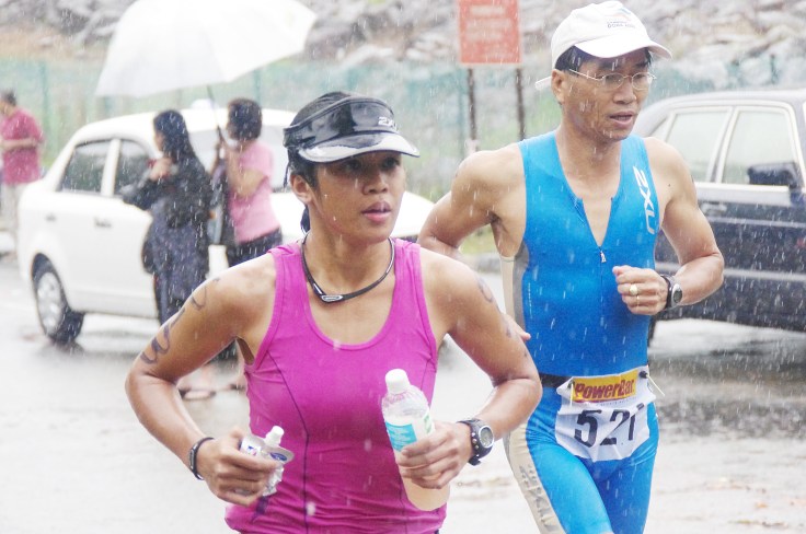 Michelle Looi joined my for the 1st 1-2km of the run but she had to fall back due to cramps in her legs. I manage to over take both Michelle and Jaja near the end of the bike leg when were were ALL struggling to go up THAT last hill. The only difference was that I was not pushing my bike. I manage to not push the bike at all, and still manage to keep this pair of legs fresh for the run.. Again, must be that 2XU compressor..haha..