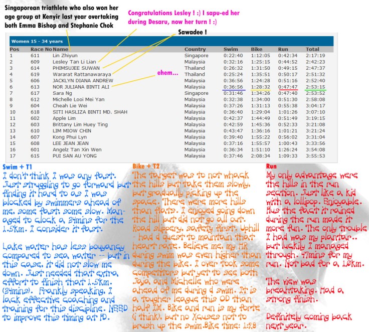5 years after my first triathlon in 2007 at A Famosa, I finally get to do the Kenyir Lake Triathlon. Some of my friends opt not to do Kenyir because it is far. As for me, I just want to give it a try considering I have not tried the course. I have heard the course is pretty tough and hilly (see, tough and hilly are 2 different things..). And just a week before race, I saw Eugene Chan on Astro’s Kafe Arena, saying that the course this year is even tougher. Cowabunga.. missJeweLz like !!!