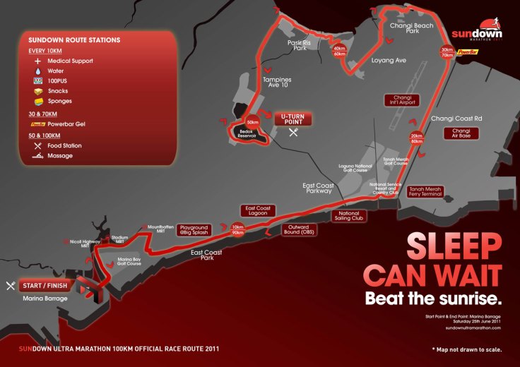 I have my gears all set, except that I need to buy a replacement pair for my ever faithful trainers ‘Brooks Ghost’, the white-green one. The route, unlike the 84km Sundown last year will cover 1 big loop. Yeap, 50km out, and 50km in. The U-turn point will be in Bedok. Among the areas the ultra runners will pass during the run are; Marina Bay Golf Course, East Coast Lagoon, the Changi Airport (in case anybody needs a quick exit ! heheh), Changi Beach Park, Pasir Race Park and Tampines Ave 10.