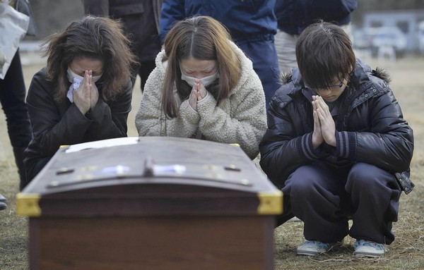 Family members grieve over the coffin of Masami Takahashi during a burial service at a temporary burial site in Kensennuma, Japan. Under Japanese Buddhist practice, a cremation is the expected traditional way of dealing with the dead, but now with the death toll so high crematoriums are overwhelmed and there is a shortage of fuel to burn them. Local municipalities are forced to dig mass graves as a temporary solution. More than two weeks after the magnitude 9 earthquake and tsunami struck Japan the death toll has risen to over 10,000 dead with still thousands missing and the expectation is that it will end up well over 20,000. Photo by Paula Bronstein, Getty Images / March 27, 2011