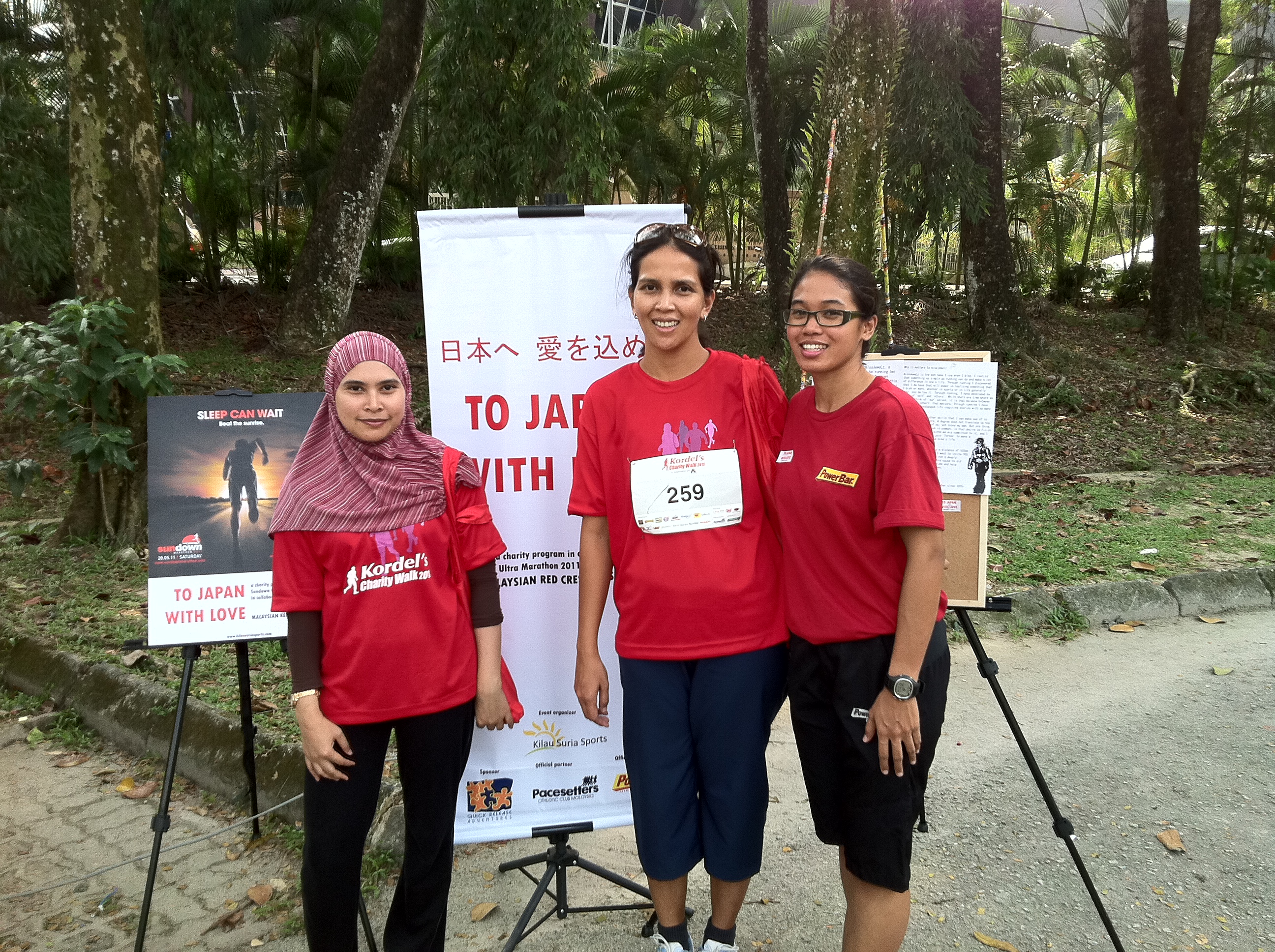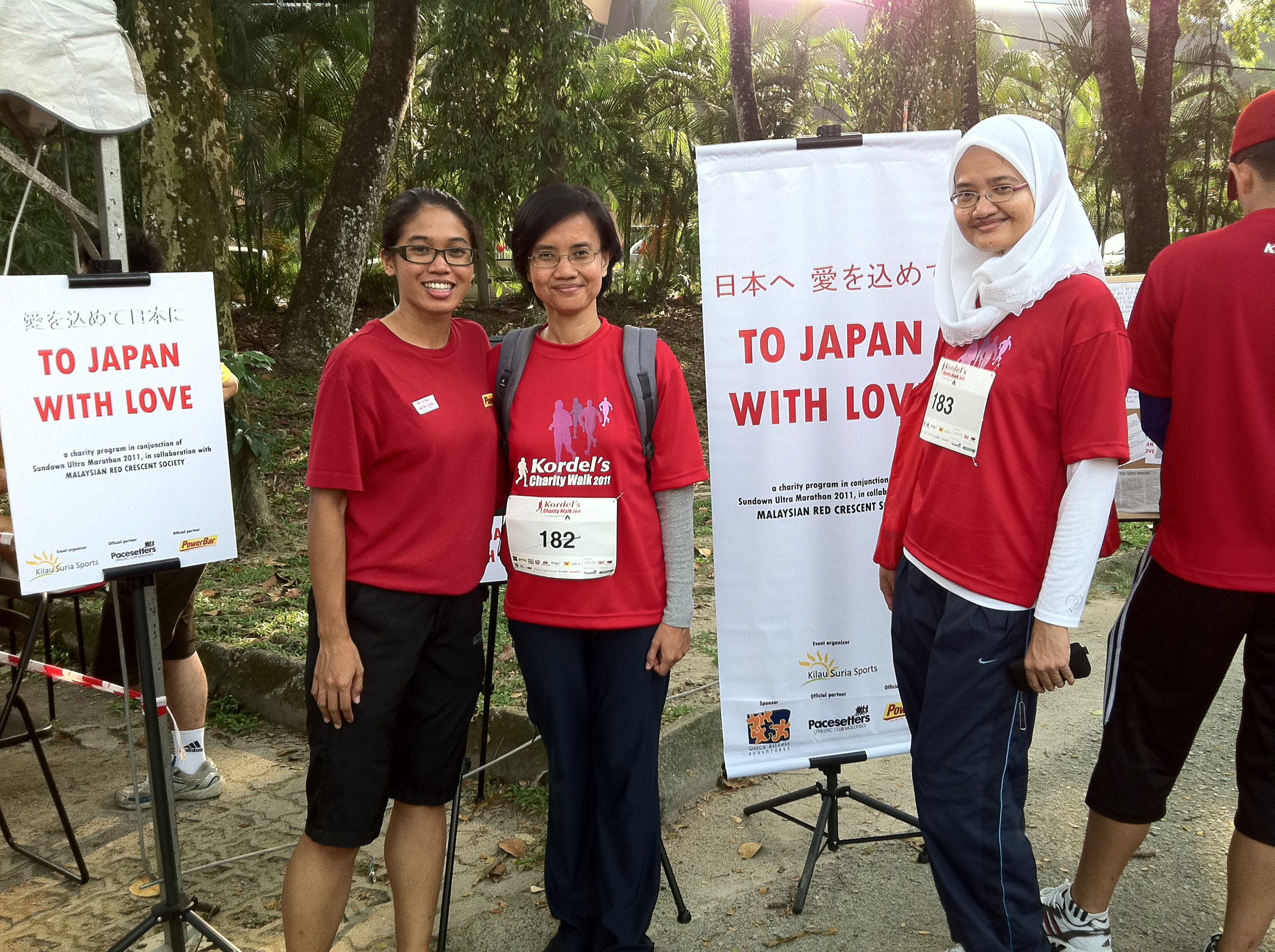 I would like to also express all of you who came and drop by our booth whether to get more info on the event, purchase the charity stickers or pledged for the cause (not forgetting Kordel Walk organizer who offered to announce the charity drive on the microphone 🙂 ). An overwhelming response I must say. Sharing is caring, and sharing this very cause with all of you to come (and those who came) forward to donate for Japan. It is never too late for this, and in fact, I am happy to announce that the closing date for this charity drive has been extended to the 20th June 2011. Other friends i.e. Tan Chin Chim, Aliya and his son Daniel, Siok Bee, Alexandra Leong, Judy Chua, Leena and Goh Choon Aun who came later to help us pack up after event walk ended.