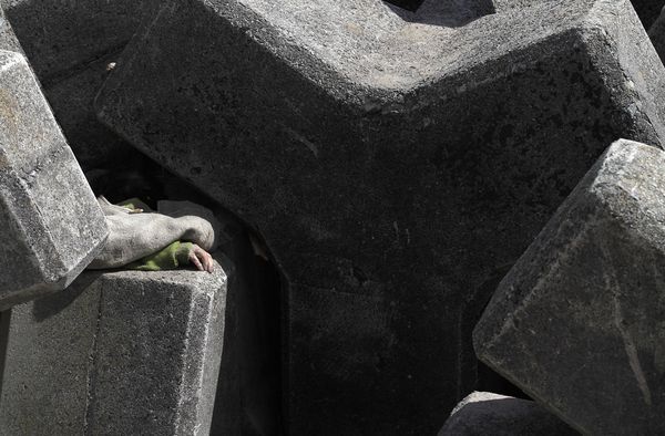 The hand of a man killed by the Japan earthquake juts out of jumbled concrete sea barriers on March 14 in Toyoma, Japan. Photograph by Gregory Bull, AP