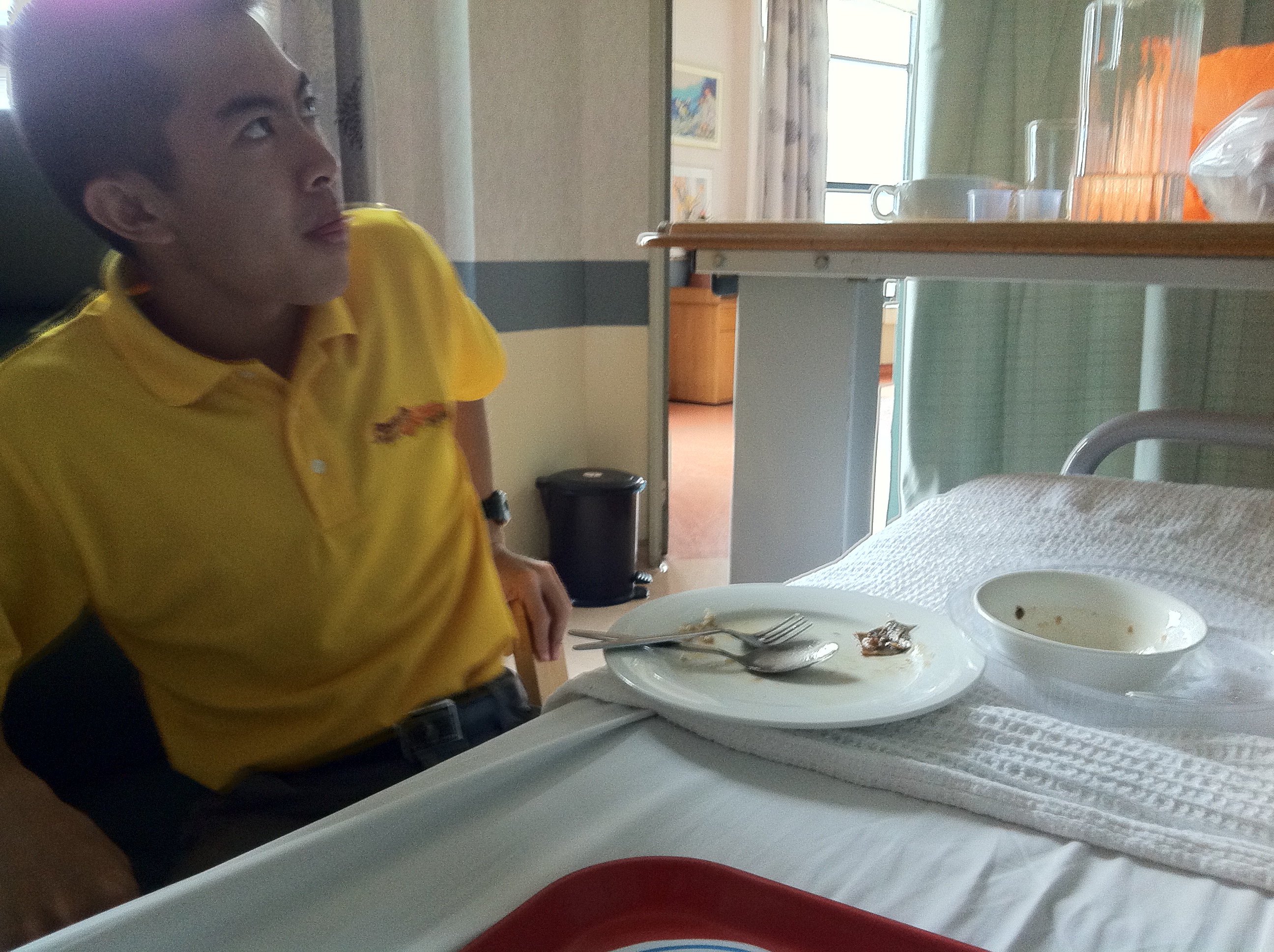 Chan - licin pinggan nampak ! hihi.. Carbo-loading for his maiden Powerman kat hospital.