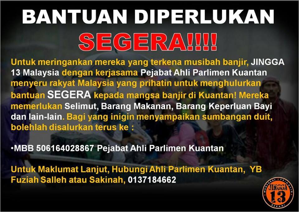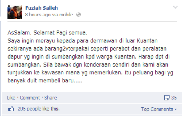 Saya ingin merayu kepada para dermawan di luar Kuantan sekiranya ada barang2vterpakai seperti perabot dan peralatan dapur yg ingin di sumbangkan kpd warga Kuantan. Harap dpt di sumbangkan. Sila bawak dgn kenderaan sendiri dan kami akan tunjukkan ke kawasan mana yg memerlukan. Itu peluang bagi yg banyak duit membeli baru…..