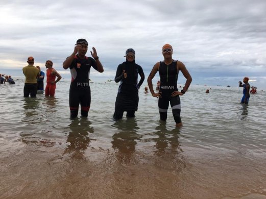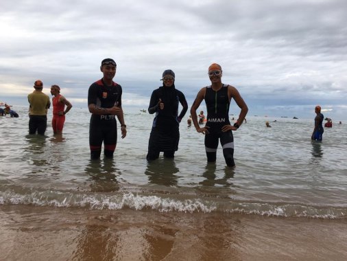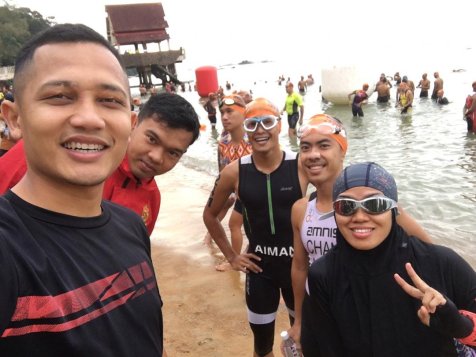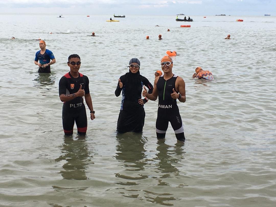 In the midst of all this race morning chaos, the only apparent thing was How shall I survive that swim? All that training doesn’t equate a 5 years not swimming for more than 1.5km in the pool what more in the open water. A few friends mentioned about the salt water crocs being spotted at the very water where the swim will take place. I know insyaAllah with proper safety checks, observation and water combing, the race course should be cleared from any danger manmade or natural. InsyaAllah. I trusted the army too in doing that job well. I just wanted to survive the swim and proclaim my own little record my first open water swim after so long.