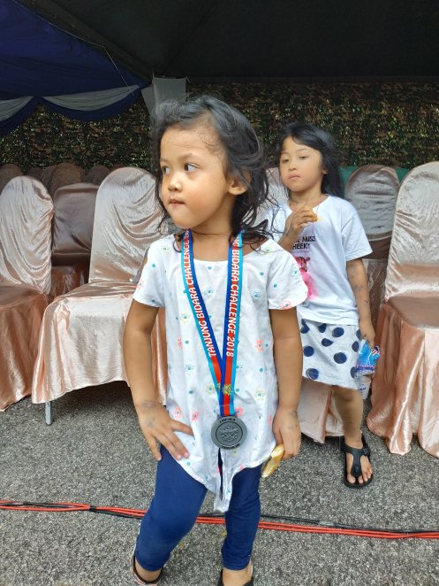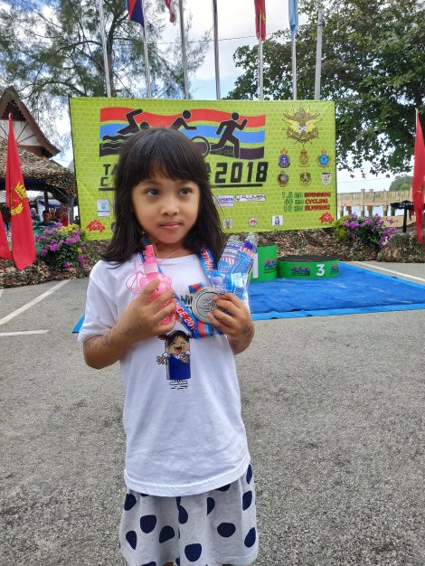 Passed the transition area, and last few meters to finish line. Mannn that was one long race…Passed the playground next to the transition area and I knew I couldn’t end this challenge without my 2 beautiful daughters with me. They are my heart and soul ! Called their names a times before eventually appeared from the playground. Kakak literally pulled my hands to run faster and said why mummy run so slow?? (cz they waited so long for me to finish !), While I made sure I had a strong grip on Aminah so that she won’t trip over as her kakak kept tugging me. The crowd at the finishing arch cheered as we made our way to the finish line and boy Wasn’t that the sweetest thing ever!! Thank you everyone who made put moment extra memorable at the finish line! I am not sure who presented the medal when we finished, but he was sweet enough to ask who shall he present the medal to. I said this one, pointing to my youngest daughter.