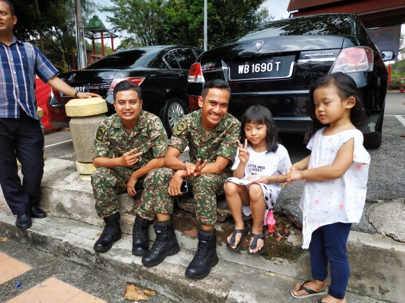 I didn’t or couldn’t catch on the water station but I trust that the army better be stocked and well-organised with the race course logistic. My observation was rolling the moment I drove into the race vicinity. Everyone was doing something related to race prep/organisation. My kids were of course excited to see pakcik2 soldiers in their respective uniforms ! Aminah couldn’t stop crying ‘Soldier!!!’ to them. Haha.. a little embarrassing but I let her have her moment. Minah ohh Minah…